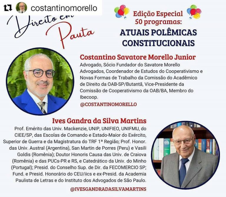 LIVE COM CONSTANTINO MORELLO 50ª Edição do Programa Direito em Pauta Assunto: “Atuais Polêmicas Constitucionais” Convidado: Dr. Ives Gandra Martins Realizada em: 20/05/2021
