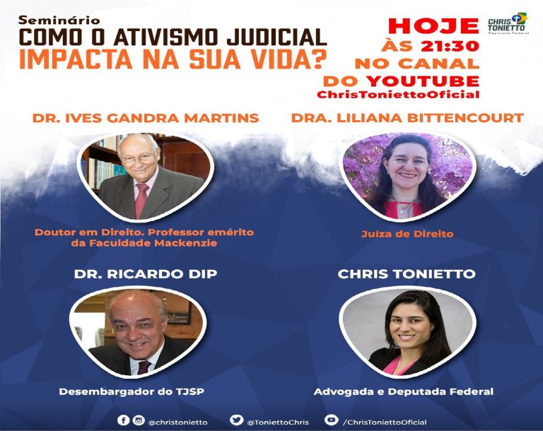 SEMINÁRIO ONLINE COM A DEPUTADA FEDERAL CHRIS TONIETTO Tema: “Como o Ativismo Judicial impacta na sua vida?” Convidado: Dr. Ives Gandra da Silva Martins Realização: 09/06/2021