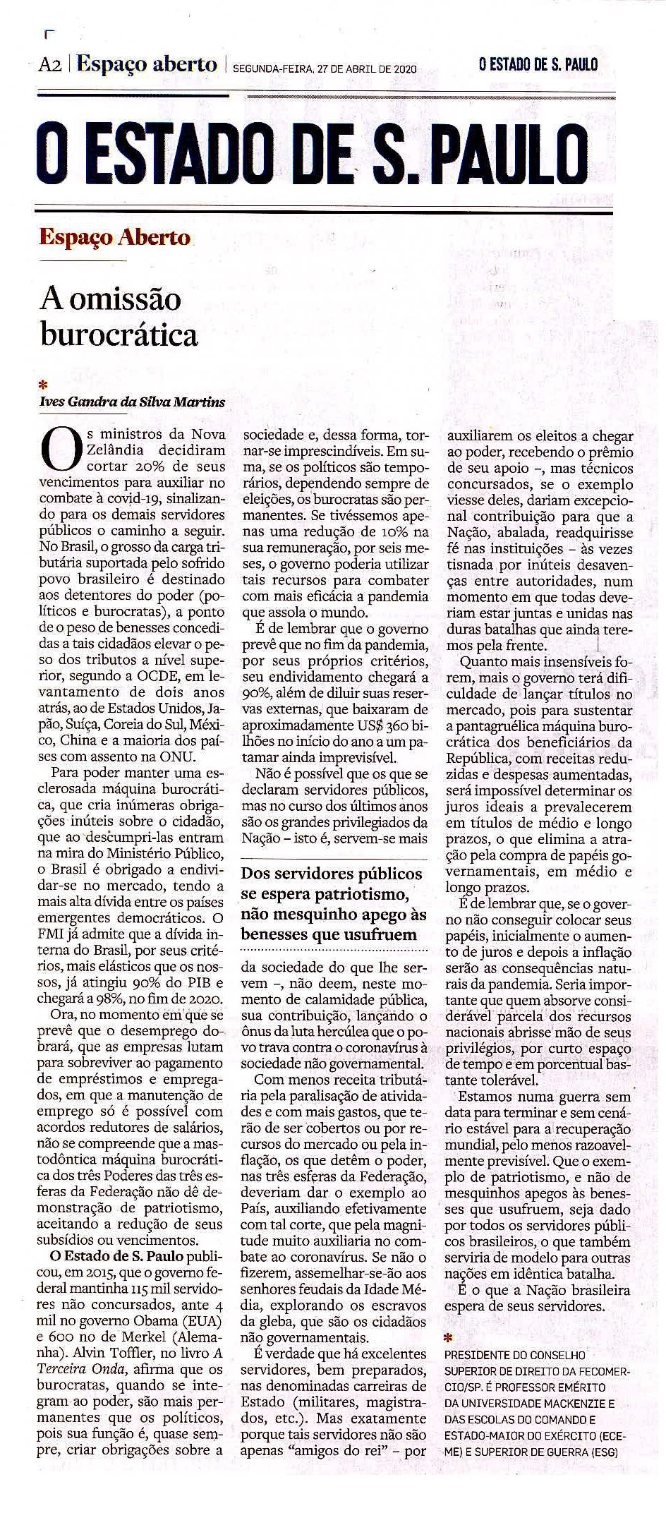 Artigo de autoria do Dr. Ives Gandra da Silva Martins, publicado no jornal O Estado de S. Paulo.