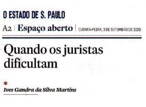 Artigo de autoria do Dr. Ives Gandra da Silva Martins sob o título: “Quando os juristas dificultam“, publicado no jornal O Estado de S. Paulo do dia 03/09/2020.