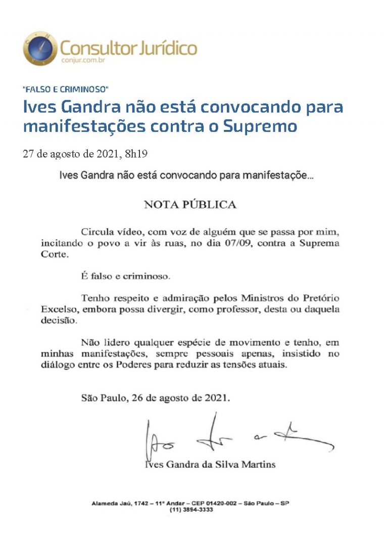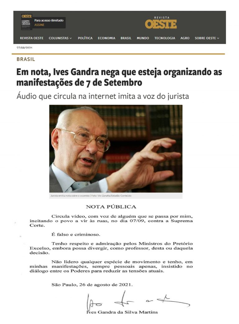 Em nota publicada no site da Revista OESTE do dia 26/08/21, Ives Gandra nega que esteja organizando as manifestações de 7 de setembro. Link de acesso ao site da revista: Clique aqui para fazer o Download
