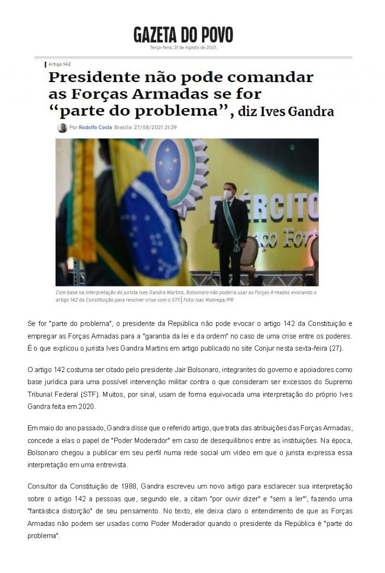 Presidente não pode comandar as Forças Armadas se for “parte do problema”, diz Ives Gandra Artigo escrito por Ives Gandra Martins, extraído do site do Conjur e publicado na Gazeta do Povo. Link de acesso ao site do Gazeta…