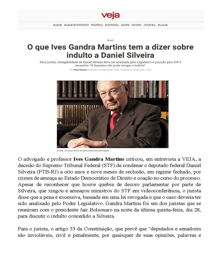 “0 que Ives Gandra Martins tem a dizer sobre indulto a Daniel Silveira” Matéria de Felipe Mendes, com opinião do jurista Ives Gandra Martins, publicada no portal da revista VEJA, do dia 30 Link de acesso ao site da Revista…