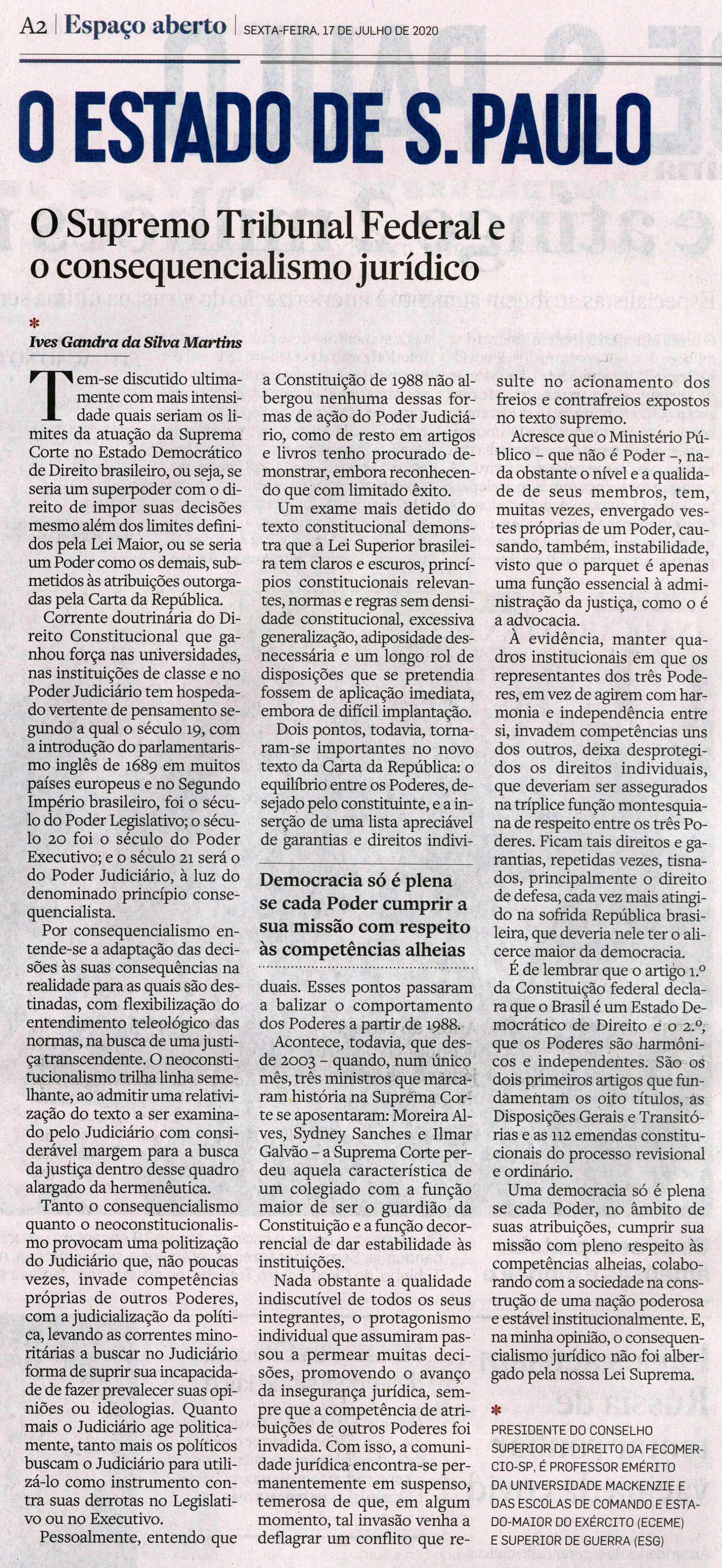 Artigo de autoria do Dr. Ives Gandra Martins sob o título “O Supremo Tribunal Federal e o consequencialismo jurídico”, publicado no jornal O Estado de S. Paulo.